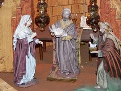 Hoy ocupa toda una sala en la que el visitante asiste al ciclo completo del día. Empieza el amanecer con el canto del gallo y la luz tenue nos deja ver con exactitud todas las figuras. De pronto, se apagan las antorchas de los pajes que acompañan a los Reyes Magos y sale el sol. Entonces comienza la jornada de trabajo y las figuras cobran vida. El alfarero hace vasijas de barro y la granjera da de comer a las gallinas. Cuando llega la noche cesa la actividad y sólo se oye el sonido del río. Mª Carmen insiste en que todos los años invitan a los colegios nazarenos para que visiten el Belén. Este año también tienen reservas de Sevilla.
