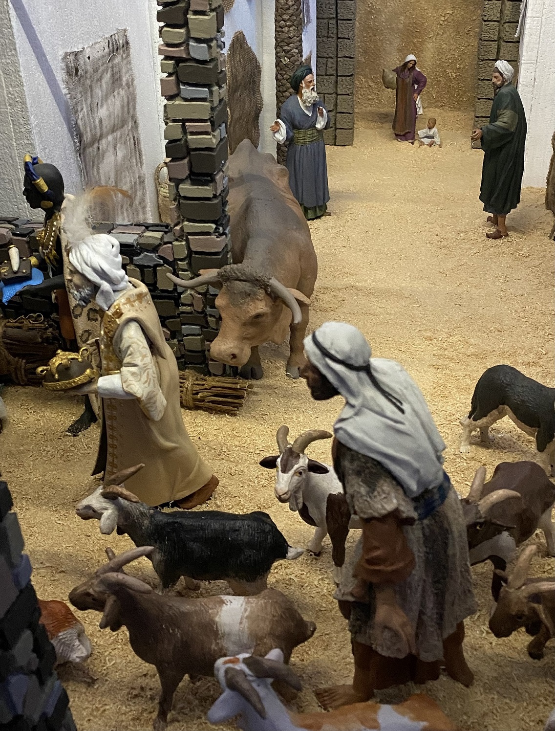 Las figuras de 1er plano son de 24 cms. El Misterio y Los Reyes en Adoración son de Javier Guilloto. Al igual que los Pastores y el Ángel de La Anunciación. En ese primer plano hay un pastor, estreno de este año, de Hermanos Cerrada. El rebaño de cabras de ese pastor y el rebaño de ovejas de la escena de La Anunciación son de Villarán. El perro pastor del rebaño de cabras es de los Hermanos Cerrada también, igual que la Mula y el Buey del Portal.