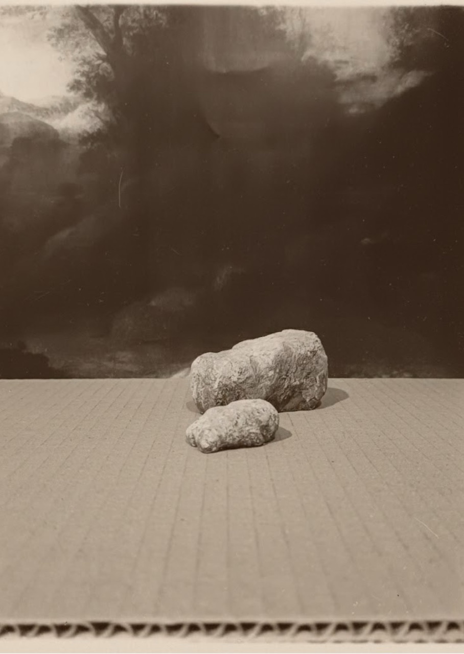 Era el escenario del "todavía no", el kairós suspendido donde la materia humilde se reconoce digna de sostener lo sagrado. En ese silencio de celulosa y sílice, las piedras no eran solo piedras; eran la teología del cansancio antes de ser dormida, la dureza del camino antes de ser andado. Representaban la honestidad absoluta de una creación que no necesita ocultar sus costuras [las estrías del cartón, los poros de la roca] para proclamar que el Misterio está a punto de suceder sobre la superficie más plana y sencilla que la mano del hombre pueda disponer.