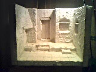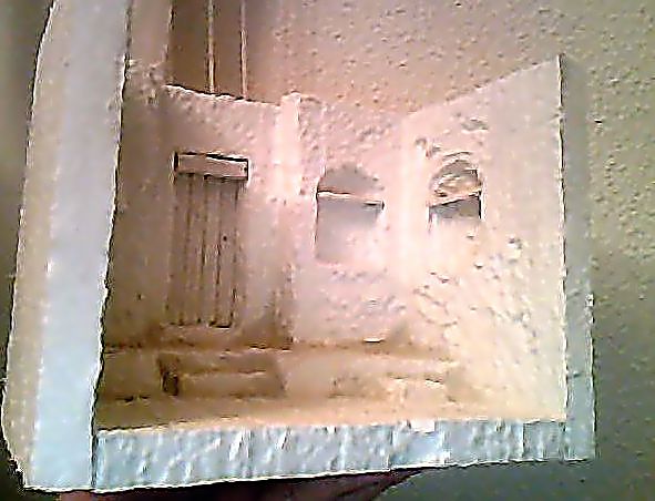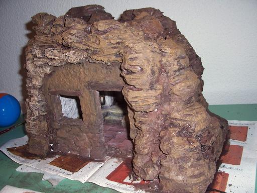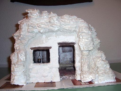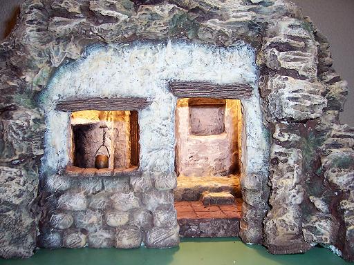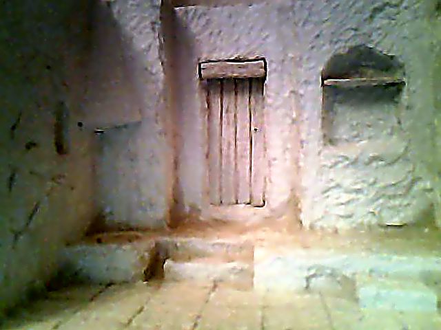 Tengo una duda, que no sé si seré capaz de hacértela comprender. Si, como tú mencionas, se trata de una cueva horadada en la pared y cerrada con una fachada de obra, esta fachada sería recta en linea exterior y estaría situada en primer plano, pero tal y como presentas la distribución de los elementos parece ser que está todo visto desde el interior, es así? entonces, si la roca está detrás del conjunto, esa puerta que se ve no sería la propia de la vivienda, sino una interior, correcto? y si estoy yo equivocado y sí que es la puerta exterior, entonces los elementos de la vivienda como chimenea y hornacinas quedarían fuera de ella, no?