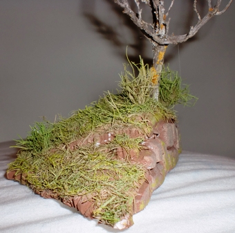 En las montañas cerca de casa de mi madre recogi unas hierbas que crecen en locais áridos, la coloreé de verde y la inserté com um palillo de madera en el porexpan.