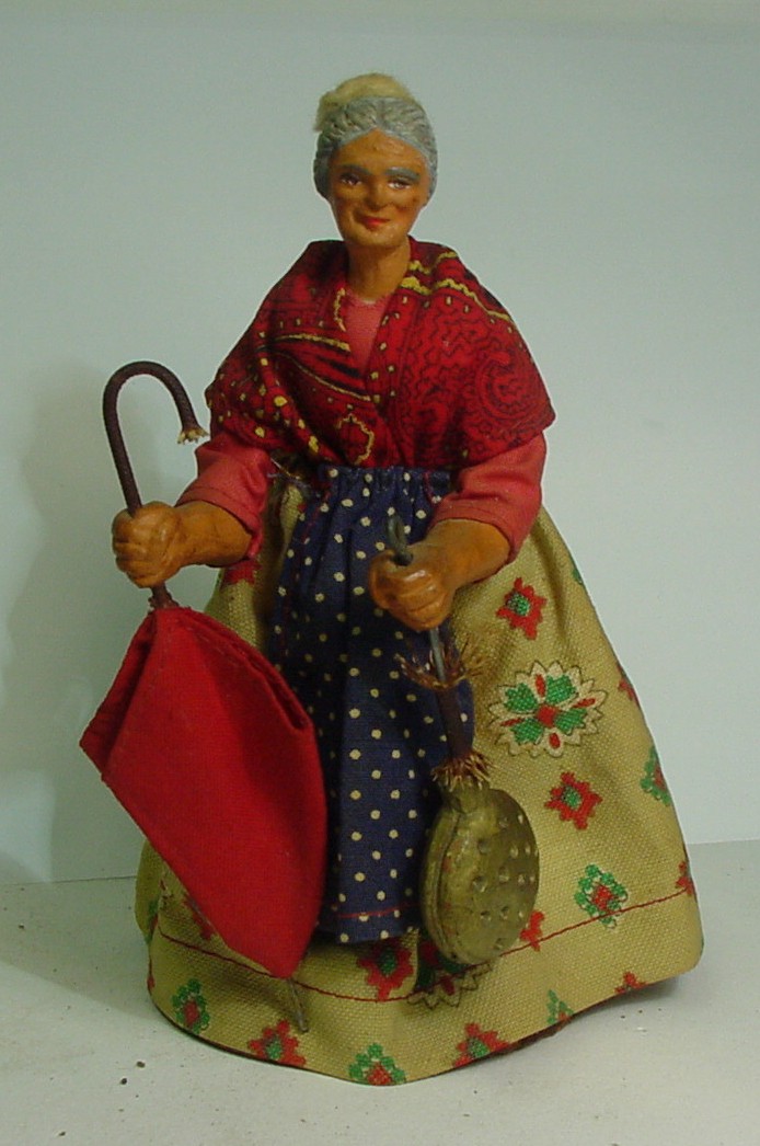 Es una santona muy clasica del Belen Provenzal ; la Dueña con el paraguas rojo llevando consiguo al Belen Provenzal su calentador de cama ! ..que las noches de invierno son tan frias en los alrededores del mont Ventoux !