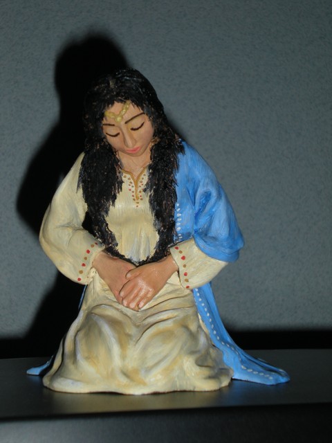 Un trabajo que va muy bien encaminado, lo que logro ver se ve bien, hay detalles que mejorar, pero en gustos ya sabes no hay nada escrito, lo del pelo no veo tanto el problema, puede que se haya recien levantado y ya sabes el cabello se le ve muy enmarañado, pero se puede arreglar incorporando un manto o mantilla o si aún es tiempo disminuir un poco de cabello y alizar, lo otro son las manos, dolor para casi todos los que hacemos o tratamos de hacer figuras, cuando nos cuesta hacer manos lo mejor es esconderlas un poco, o simplemente trabajar y trabajar en hacer manos, yo las hago aparte y las trabajo con agujas hipodermicas que le dan un acabado bueno y sirven para separar dedos, cada uno con sus formulas, ya ahora solo decirte que sigas y que es una buena pieza, felicitaciones...