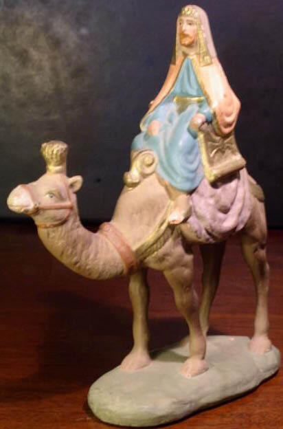 Una cabalgata de Reyes muy sencilla pero muy hermosa, lástima que el rey negro esté tan deteriorado y que falten dos pajes. Comprado en una tienda de coleccionistas de la calle Sepúlveda, precio correcto. Ni idea del autor, ni siquiera me suena, son figuras de 12 cm en barro, el paje tiene las manos de plomo y tiene aire de la escuela catalana. Agradeceré ayuda de los entendidos.