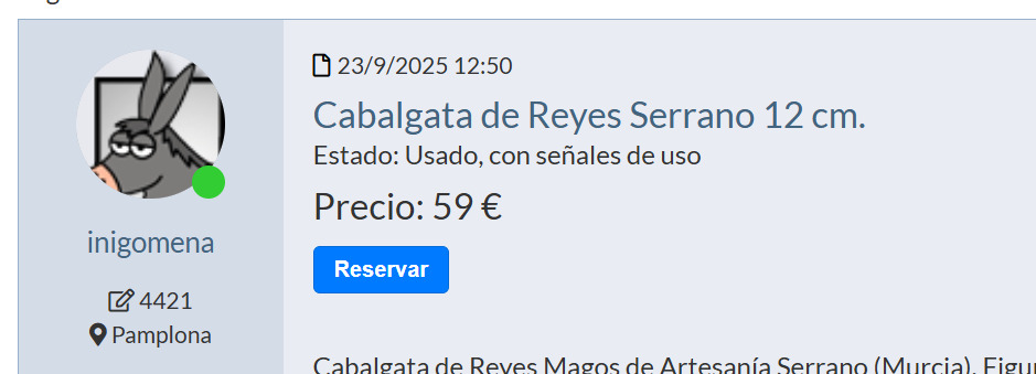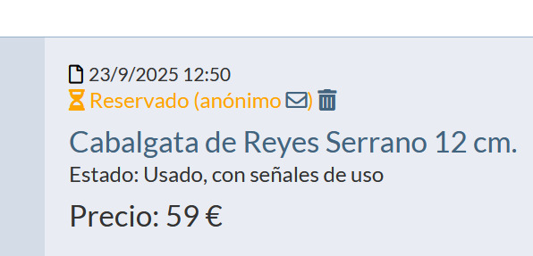 El vendedor puede cancelar esta reserva, o, si se formaliza la compra, marcar el artículo como vendido (con lo que también deja de estar "reservado", y vuelve a aparecer en el índice del mercadillo, pero ya marcado como "Vendido"). El vendedor también puede "desmarcar" el estado vendido si, por lo que sea, no se termina de realizar la venta, igual que puede marcarlo como vendido cuando quiera, no es necesario que otro usuario lo haya reservado por el método que os acabo de contar: