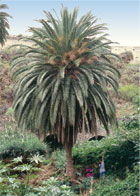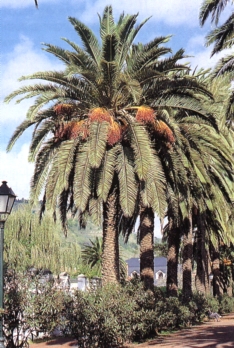 Curiosamente entre las palmeras existen individuos masculinos y femeninos. Los primeros presentan unas influorescencias de numerosísimas flores de color crema, protegidas por una especie de gran vaina. Los segundos poseen las flores sobre tallos ramificados. Existe una especie no autóctona, la palmera datilera (PHOENIX DACTYLIFERA) con la que es frecuentemente confundida.