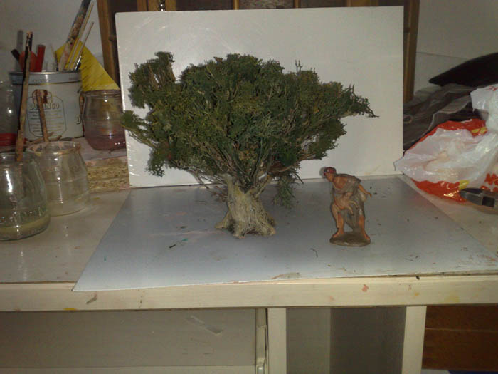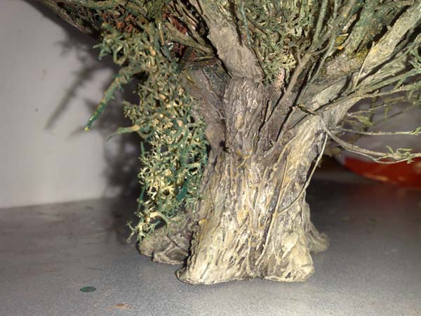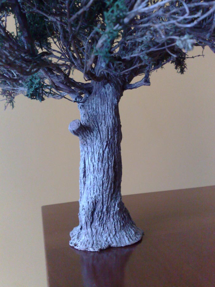 Y por ultimo procedemos a pintar el tronco eso ya a gustos,es importante pintar alguna ramita exterior con el mismo color del tronco, primero marrón mas oscuro hasta aclarar a pincel seco en grises, a mi me gusta dar unos toques de amarillo a modo del liquen que suele salir en los arboles.
