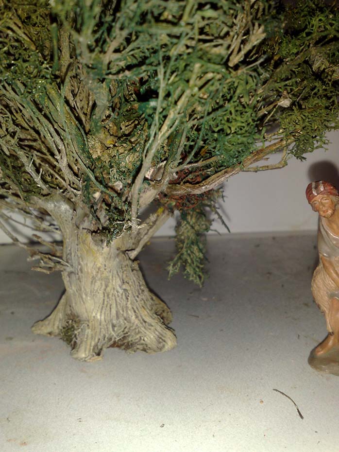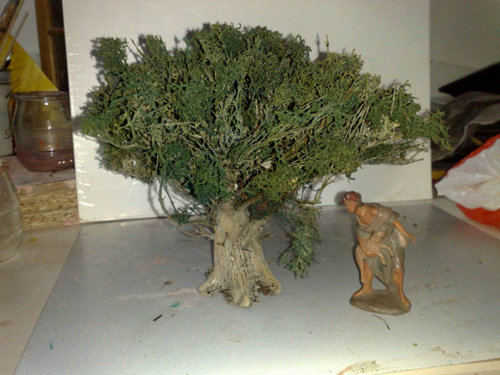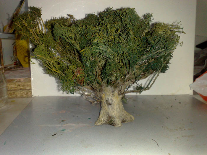 Una vez todo seco cogemos el liquen y de las bolas de liquen vamos separando trozos y lo sumergimos en la famosa disolución agua cola y vamos cubriendo los huecos de las puntas de las ramas, ya que tratamos de cubrir por encima no de llenar el árbol ya que el liquen es un poco caro, aunque en ebay lo he visto baratillo, y vamos mojando y pegando hasta que empiece a dar sensación de árbol, dejamos secar.