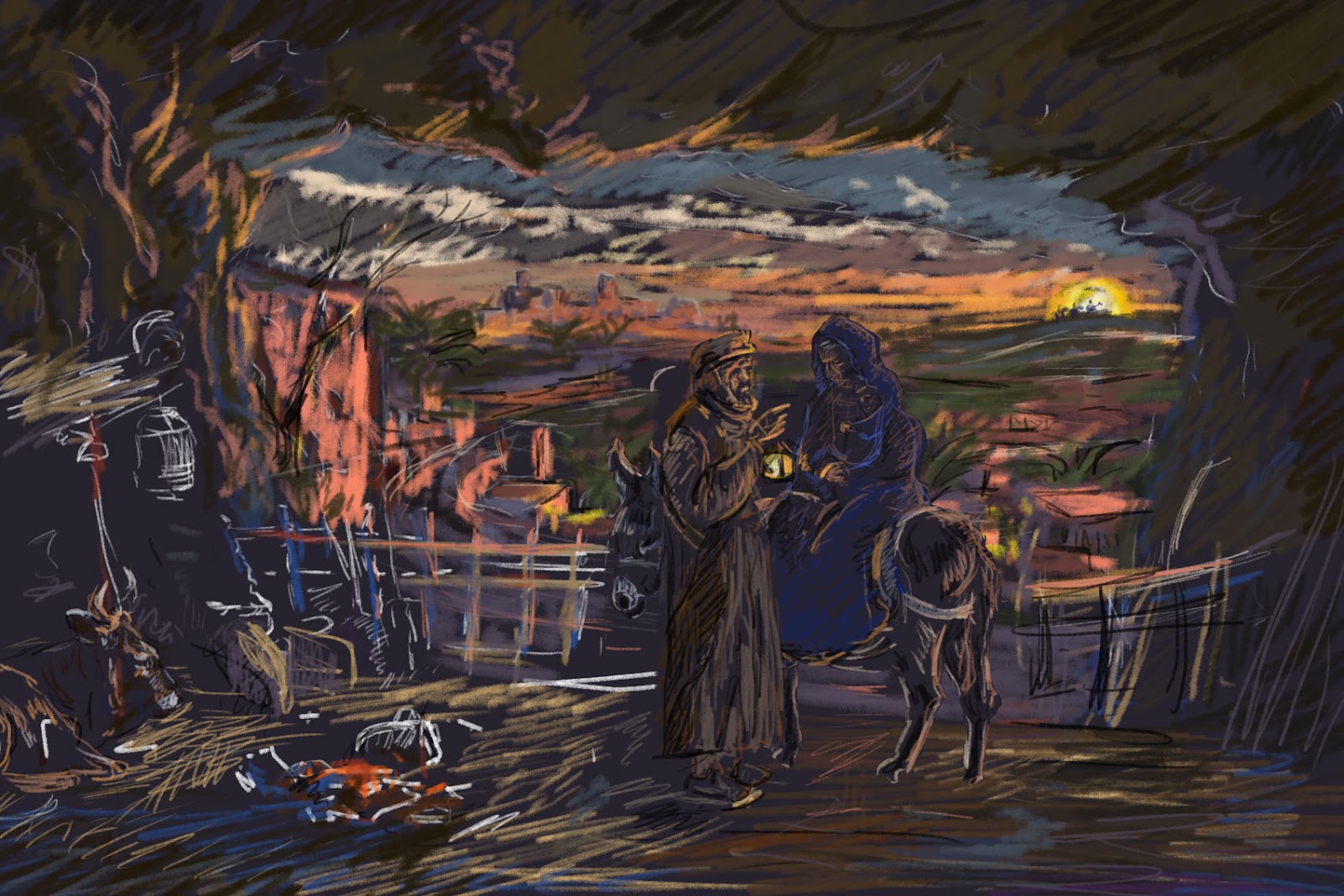 En la nueva capa [SJ] dibujo a San José, Luís sugería a SJ a punto de cojera un candil que está en un muro, pero al colocar el grupo de la Virgen Maria el Niño Jesús y el asno en los ejes áureos SJ o quedaba muy separado del grupo o este grupo se salia del eje áureo y precisamente donde ha de dirigirse la mirada desde un primer un principio es en el grupo de la Sagrada Familia.