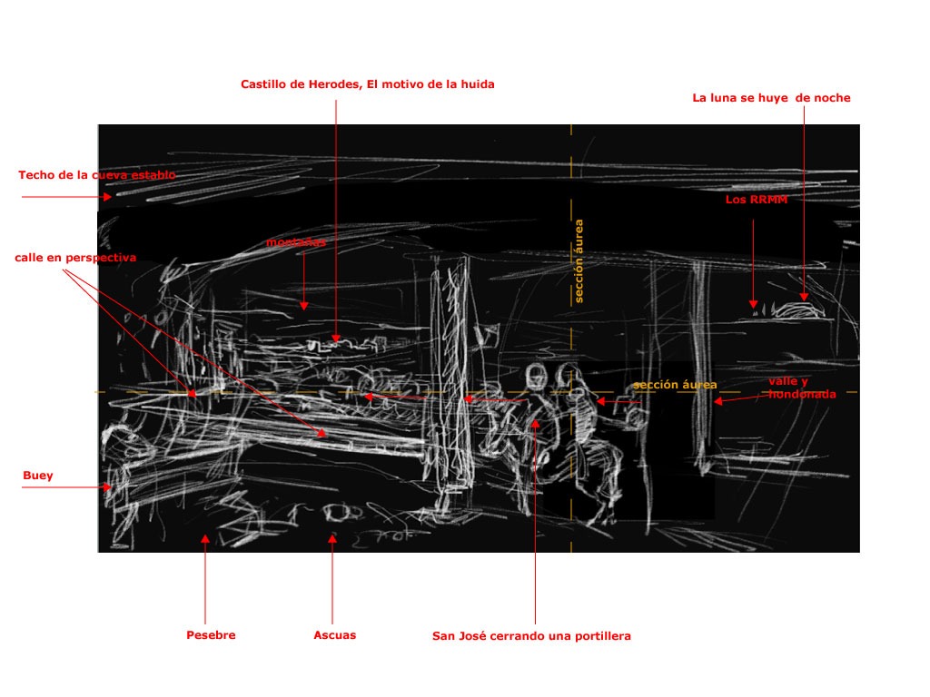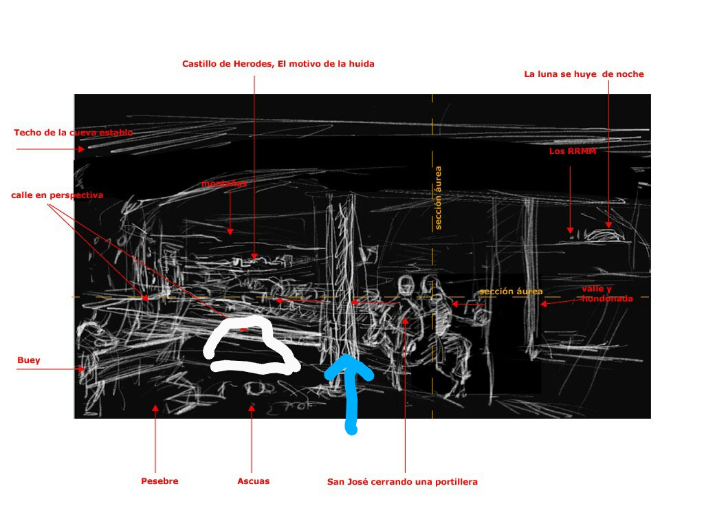 En la nueva capa [SJ] dibujo a San José, Luís sugería a SJ a punto de cojera un candil que está en un muro, pero al colocar el grupo de la Virgen Maria el Niño Jesús y el asno en los ejes áureos SJ o quedaba muy separado del grupo o este grupo se salia del eje áureo y precisamente donde ha de dirigirse la mirada desde un primer un principio es en el grupo de la Sagrada Familia.
