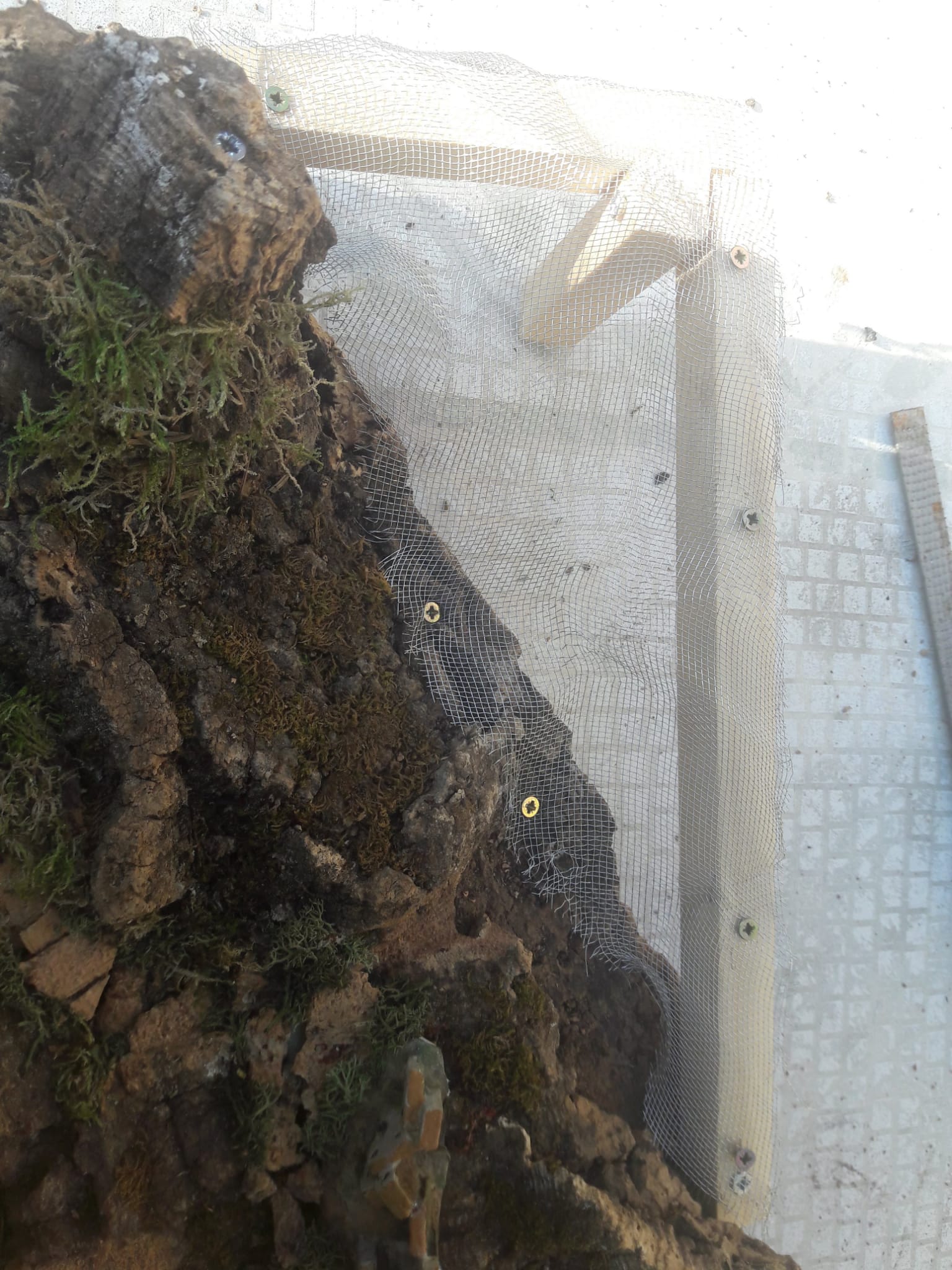 Añadimos una pieza invertida de corcho por la parte anterior de este conjunto para disminuir suavemente la pendiente del mismo para ello atornillamos entre si las piezas de corcho y rellenamos los huecos con la técnica de la tela mosquitera y el posterior recubrimiento con la papilla de borada.