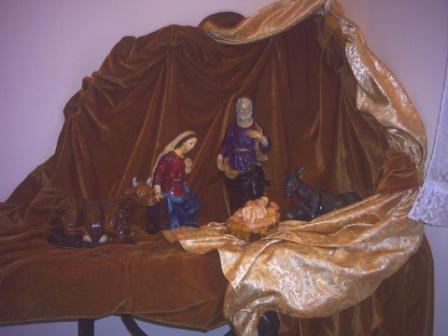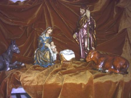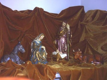 2) otras fotos son de otro Misterio (el actual): se trata de figuras de marmolina o alabastrina; más perfectas y menos toscas que las de escayola; estuve años intentando conseguir un misterio que me gustase, que se saliese de lo común; y por fín lo conseguí un año; estuvo 3 años hasta que mi madre me lo pintó con óleos; esta vez nada de pan de oro y plata, sino más sencillo, más oriental, más histórico; quisimos que san José fuera un anciano y no tan joven como suele representársele; los colores de la Virgen, rojo y azul, simbolizando su martirio y su pureza; el paño del niño con ribetes morados, anticipando la Cruz.