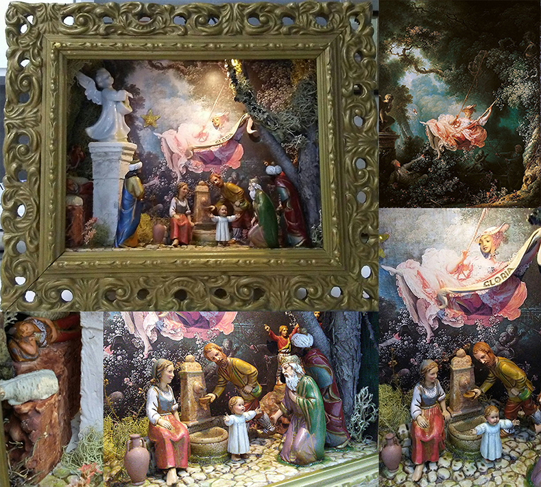 Lo que presta un significado particular al tercer belén (diorama que hice para regalar en las Navidades de 2018)-con el cuadro de “El Columpio” de Fragonard como decorado de fondo- es la representación de la representación , al enmarcar el escenario (diorama de la Epífania) que es ya por definición un lugar de representación. Atendiendo al cuadro de fondo con una gran carga lúdica y representativa de toda una época (siglo XVII-XVIII), entran en escena personajes profanos, sagrados e híbridos para representar el acontecimiento belenístico. Las figuras centrales podrían representar una escena bucólica de las pinturas de la época que arropados por las de los Reyes y la figura del ángel-terrenal que anuncia la Epifanía provoca el nexo entre dos temas tan dispares e intensifica el significado retórico de lo representado, la Sagrada Familia.