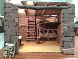 este es un portal de piedra, con techumbre con vigas de ramas y pesebre y escalera de ramitas, el suelo es arena (albero) los colores son todos naturales de los propios elementos