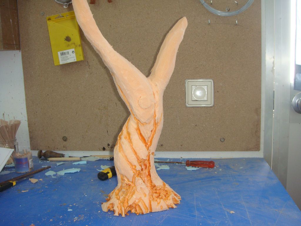 2º.- Lo voy devastando con el cúter de hoja ancha y, con el cúter de hoja estrecha, lo perfilo y le doy la forma al tronco utilizando también el soldador de estaño para las hendiduras.