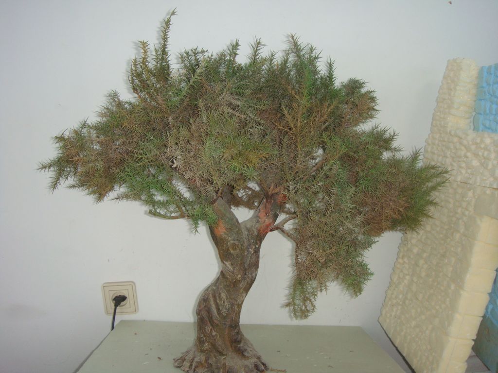 6º.- A continuación, a las ramas de aulagas escogidas, le intercepto un alambre con cola. Una vez seco, las coloco como más me guste y voy tapando la unión con pasta das.