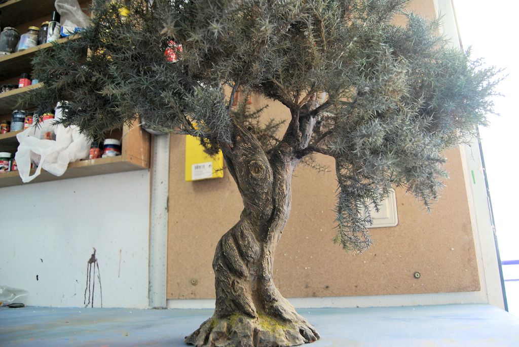 7.- Por último, revisto el tronco con papel o similar y pinto las ulagas con sprais de tres tonos verdes y uno gris buscando el tono más adecuado.