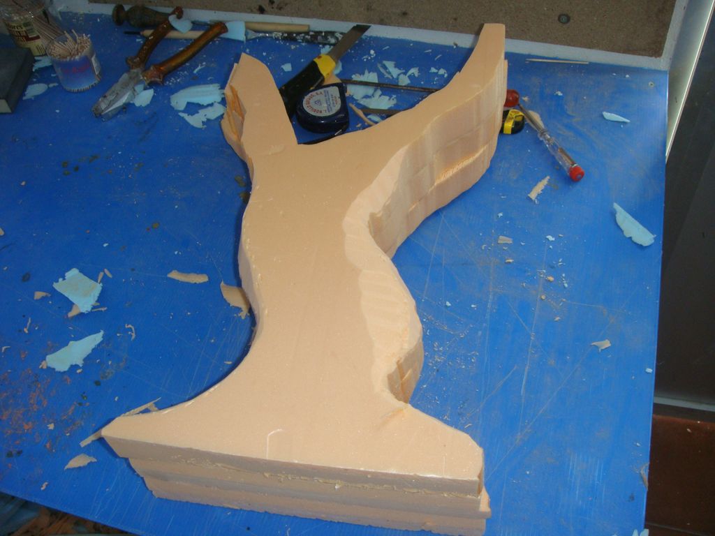 1º.- pegamos 3 planchas de porexpam extruido de 4 cms. de grosor. Luego, dibujo la forma del tronco y lo recorto con la cortadora de porexpam.