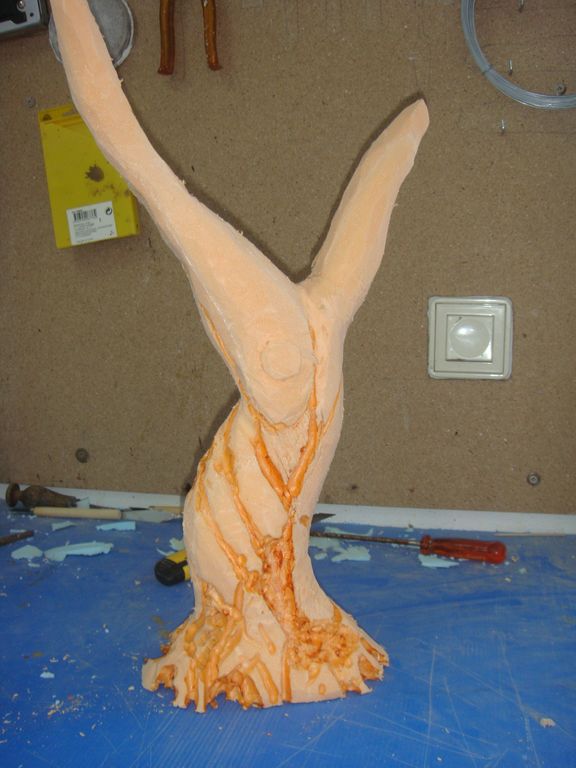 2º.- Lo voy devastando con el cúter de hoja ancha y, con el cúter de hoja estrecha, lo perfilo y le doy la forma al tronco utilizando también el soldador de estaño para las hendiduras.