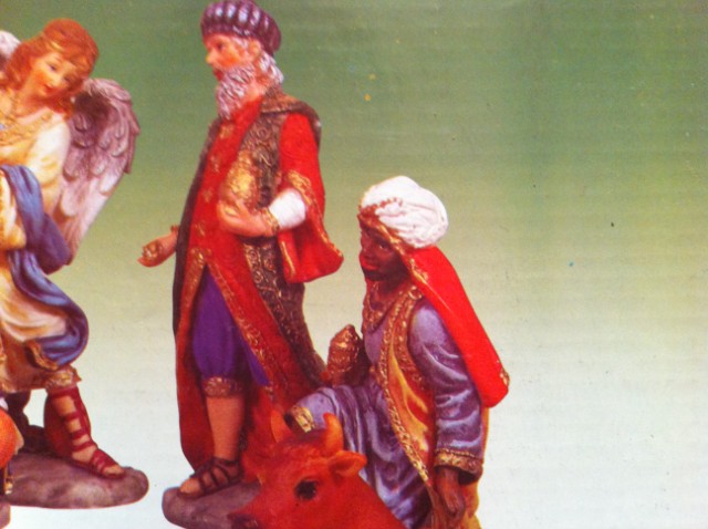 Te pongo unas fotos de la caja y otra foto de San José con la pintura negra de fondo, de ahí empezaremos a sacar colores y nos decantamos por éstas figuras para el belén Heleno.