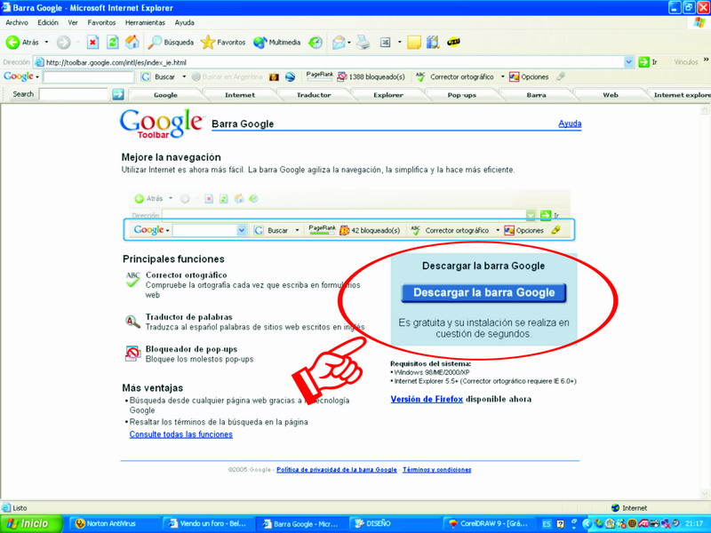 Cuando abras internet, busca la página de GOOGLE, una vez que la tengas abierta te vas a "TODO ACERCA DE GOOGLE" , cliqueas dos veces en ella y te lleva a otra página donde en la parte izquierda y en vertical, tienes cuatro recuadros con otros tantos programas y aplicaciones de GOOGLE. La primera de ellas es para instalar la barra de GOOGLE y es la que en este momento nos interesa, si cliqueas dos vece en ella te manda a otra página en la cual en su parte derecha hay un recuadro celeste, cliquea dos veces en " DESCARGA LA BARRA DE GOOGLE " , una vez echo esto te pedirá que guardes el programa en una carpeta (la que tú quieras), luego (cuando se descargue), busca la carpeta donde instalaste el programa y procede a su instalación.