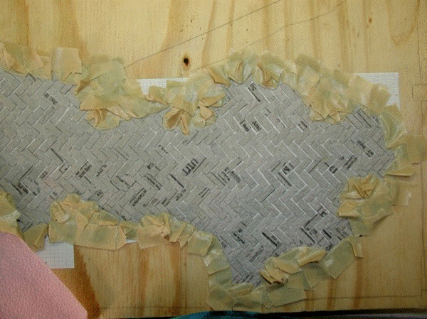 Los cartones del huevo tienen la mirada y la sensación de la piedra verdadera. Piso hecho por Dori Hatfield.