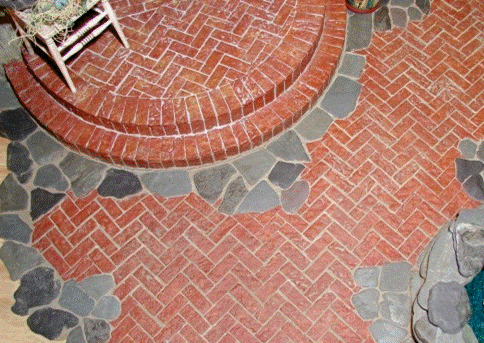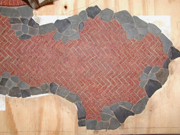 Aquí está un primer del flagstone con el ladrillo sin pintar pegado en lugar. Puse el ladrillo en un patrón de la raspa de arenque para emparejar el piso dentro del birdhouse. El ladrillo se puede poner en cualquier patrón del ladrillo que desees y que te cortas muy fácilmente para circundar cualesquiera obstáculos.