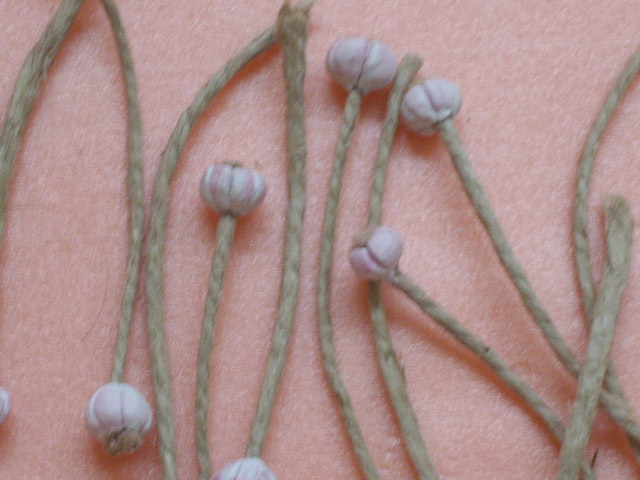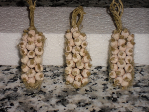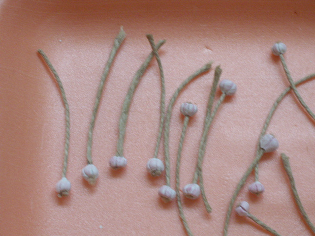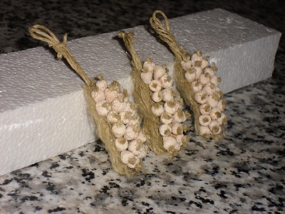 Para las cabezas de ajo, yo las he echo con pasta de modelar blanca a la que le hacía dos orificios uno para pegarle las barbas o raíces de la cabeza y la otra para pegarle el tallo. Como material para ésto he utilizado cuerda de cáñamo o esparto, que se suele emplear entre otras cosas para atar las morcillas, chorizos, etc en las matanzas y que también es muy interesante para hacer cestos, capachos,etc.