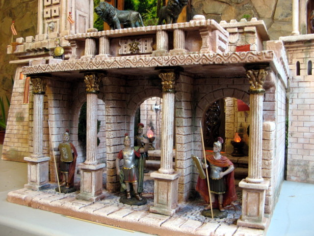 Aunque las figuras de mi belen son de 21 cm, pense en poner el castillo en la lejanía para lograr la perspectiva adecuada y así compre romanos de 12 y 10 cm y adecue apróximadamente las proporciones del palacio a esas medidas y durante tres meses he dido haciendo poquito a poquito esto que os quiero enseñar.