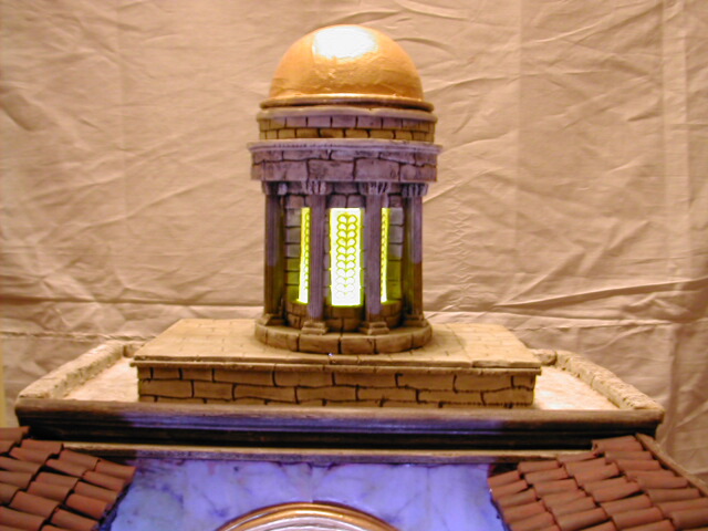 Tanto el cuerpo de las columnas, como el suelo y las paredes, están hechos con papel sacado por la impresora con las imágenes de los mármoles y los mosaicos que quería, para que no se arrugaran al pegarlos al porex, los di con adhesivo en spray de 3M para transparencias, que permite pegar y despegar varias veces y una vez que todo estuvo a mi gusto, lo he cubierto (solo suelos y paredes) con un acetato (un plastico brillante y transparente), el cuerpo de las columnas está barnizado con un barniz brillante y las bases y los capiteles de las columnas están pintados a mano semejante al color y betas del papel de impresora del cuerpo y después también barnizados.