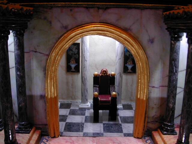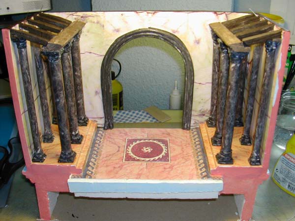Tanto el cuerpo de las columnas, como el suelo y las paredes, están hechos con papel sacado por la impresora con las imágenes de los mármoles y los mosaicos que quería, para que no se arrugaran al pegarlos al porex, los di con adhesivo en spray de 3M para transparencias, que permite pegar y despegar varias veces y una vez que todo estuvo a mi gusto, lo he cubierto (solo suelos y paredes) con un acetato (un plastico brillante y transparente), el cuerpo de las columnas está barnizado con un barniz brillante y las bases y los capiteles de las columnas están pintados a mano semejante al color y betas del papel de impresora del cuerpo y después también barnizados.