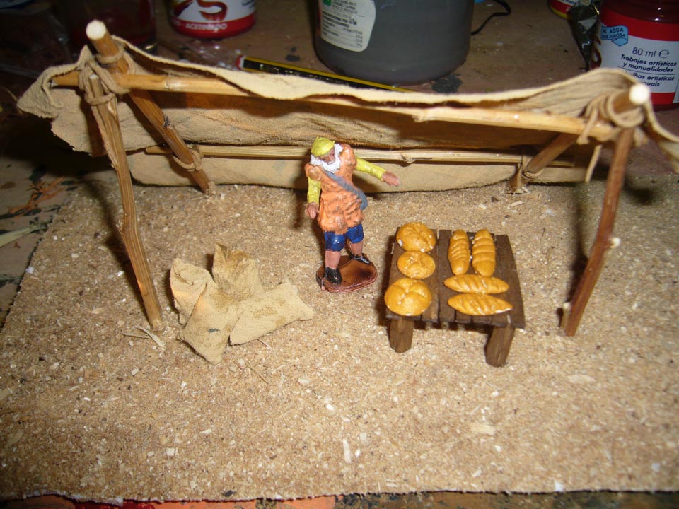 Buenas de nuevo, para el pesebre del 2012 entre otras cosas he confeccionado algunas tiendas de mercado, aqui os dejo algunas fotos del panadero en la venta de sus panes.