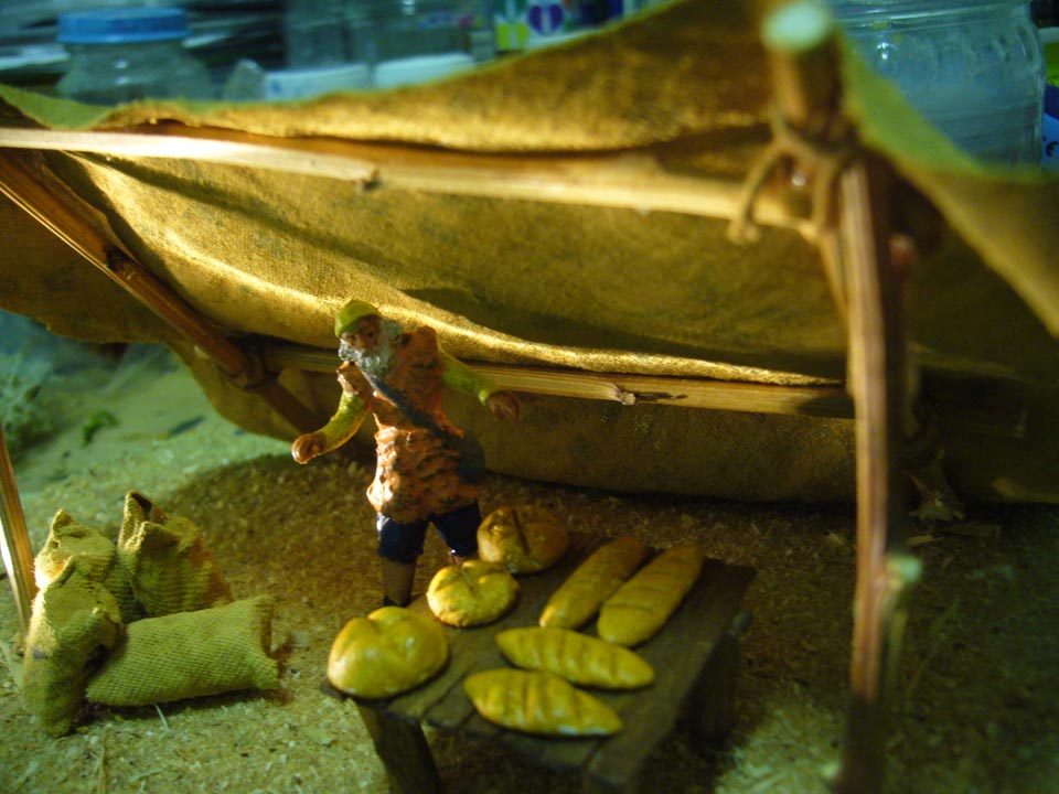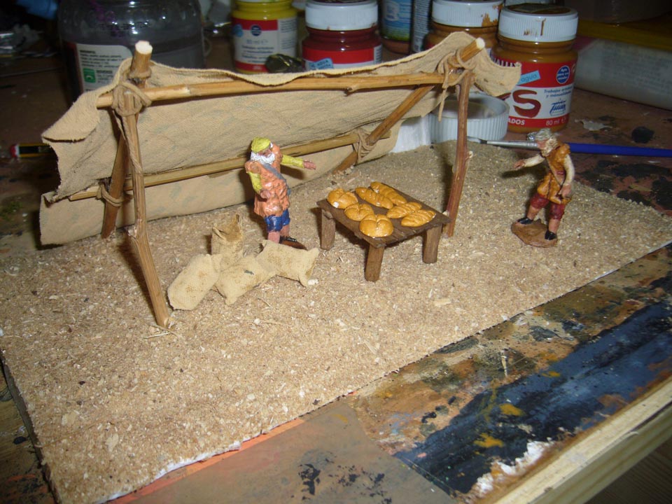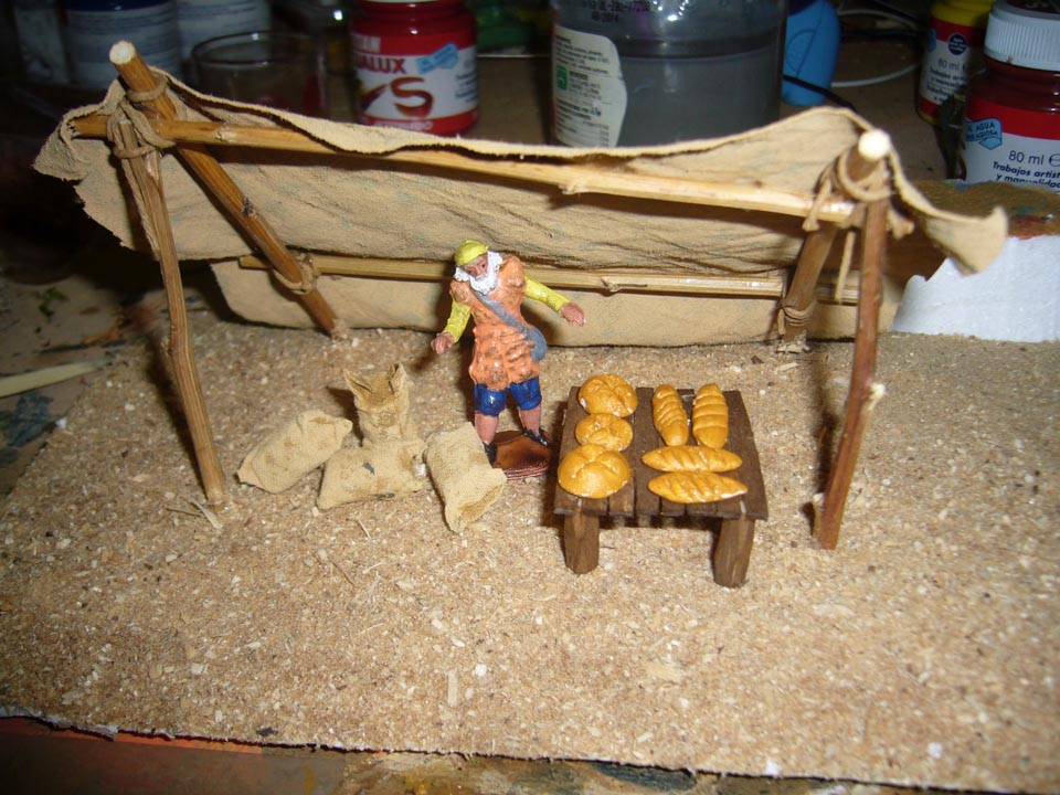 Buenas de nuevo, para el pesebre del 2012 entre otras cosas he confeccionado algunas tiendas de mercado, aqui os dejo algunas fotos del panadero en la venta de sus panes.