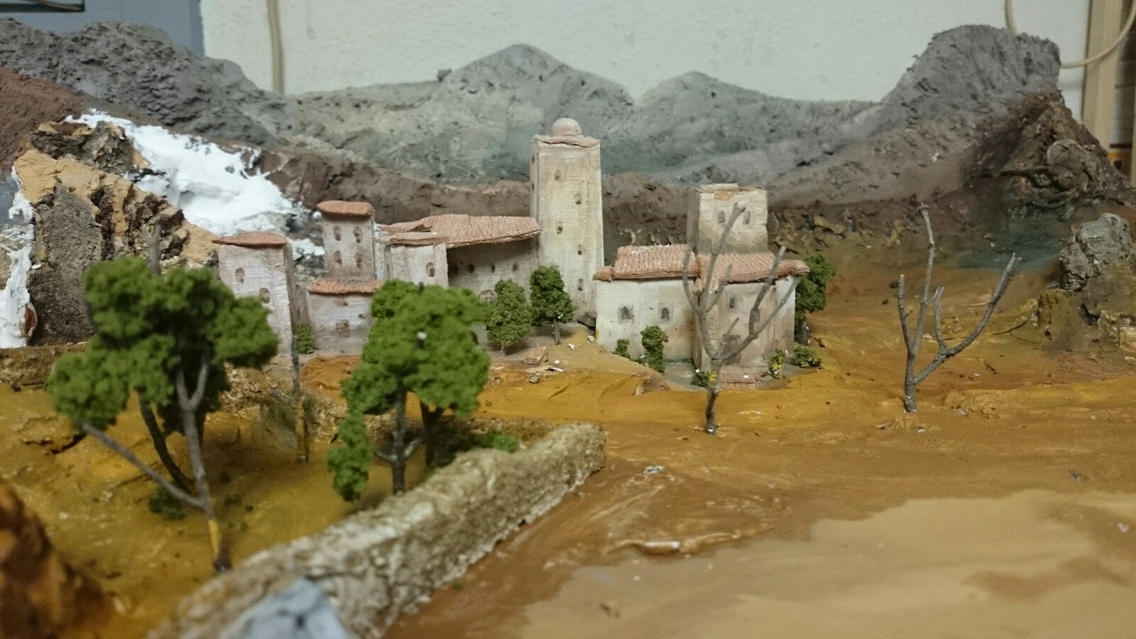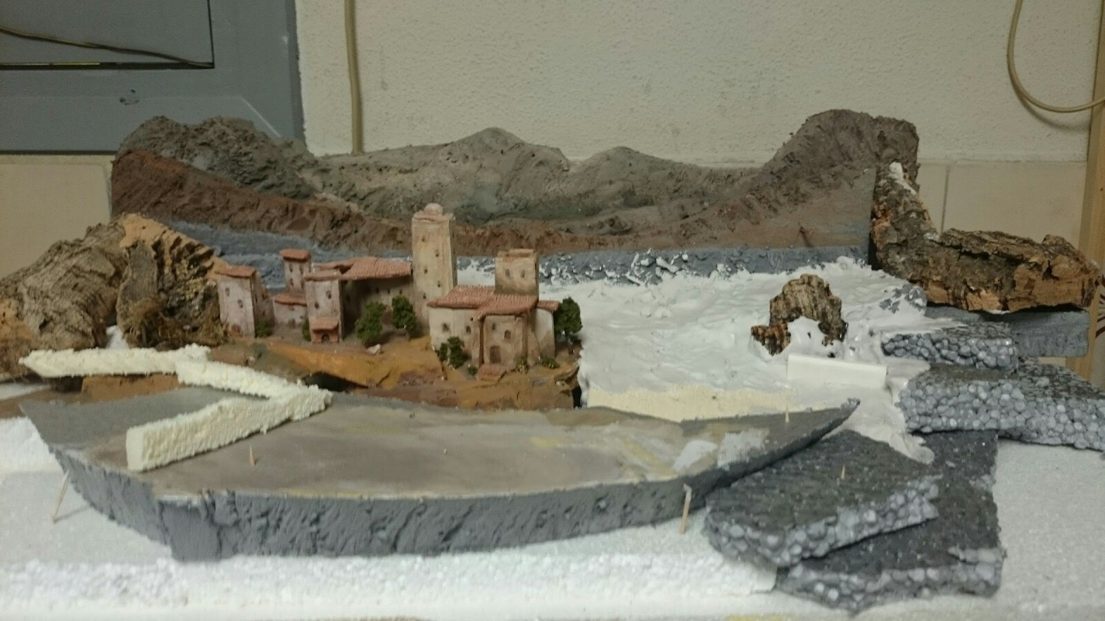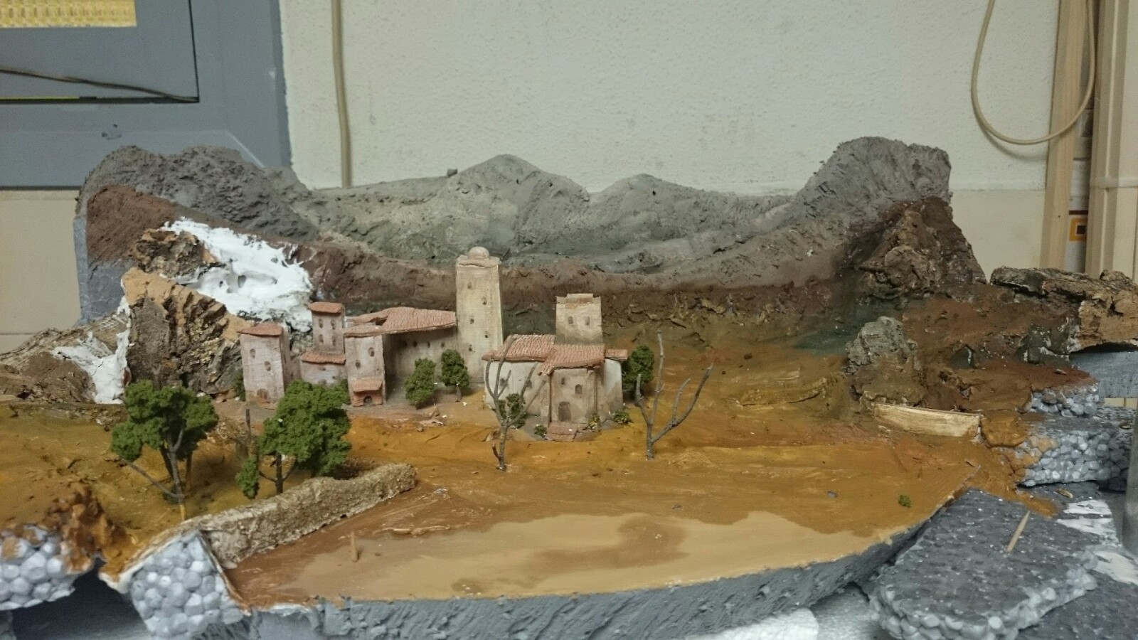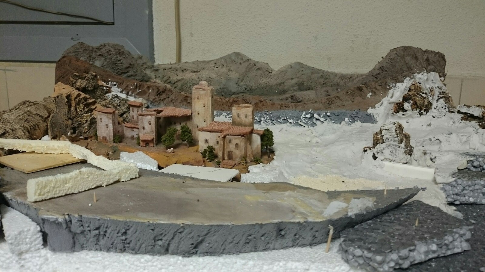 Materiales: Casas (cartón embalaje de caja térmica, escayola, arcilla escolar y acuarelas) Montañas y base (poliestireno expandido y extruido, corcho bornizo, escayola y pintado con pigmentos) Vegetación (ramas naturales y esponja pintada y triturada)