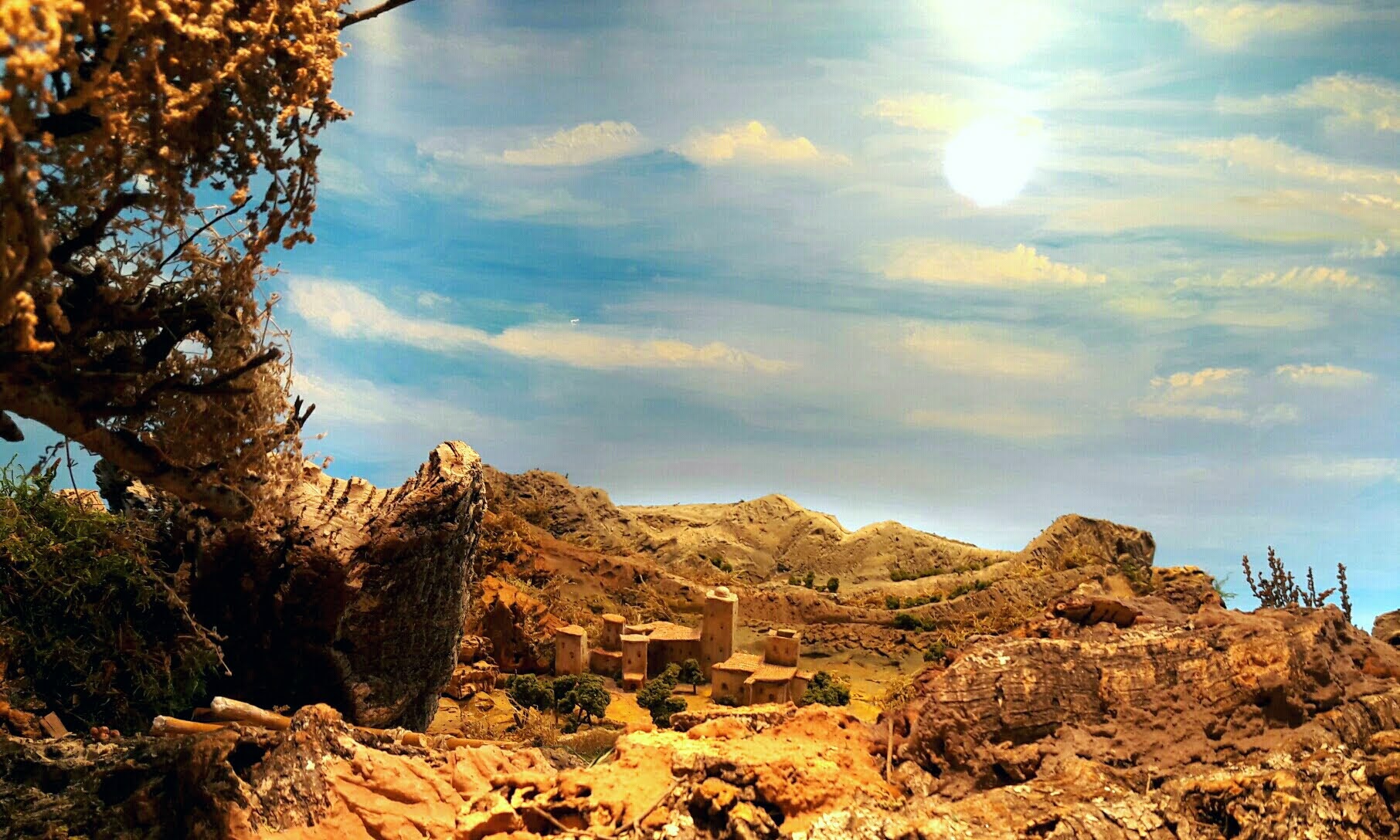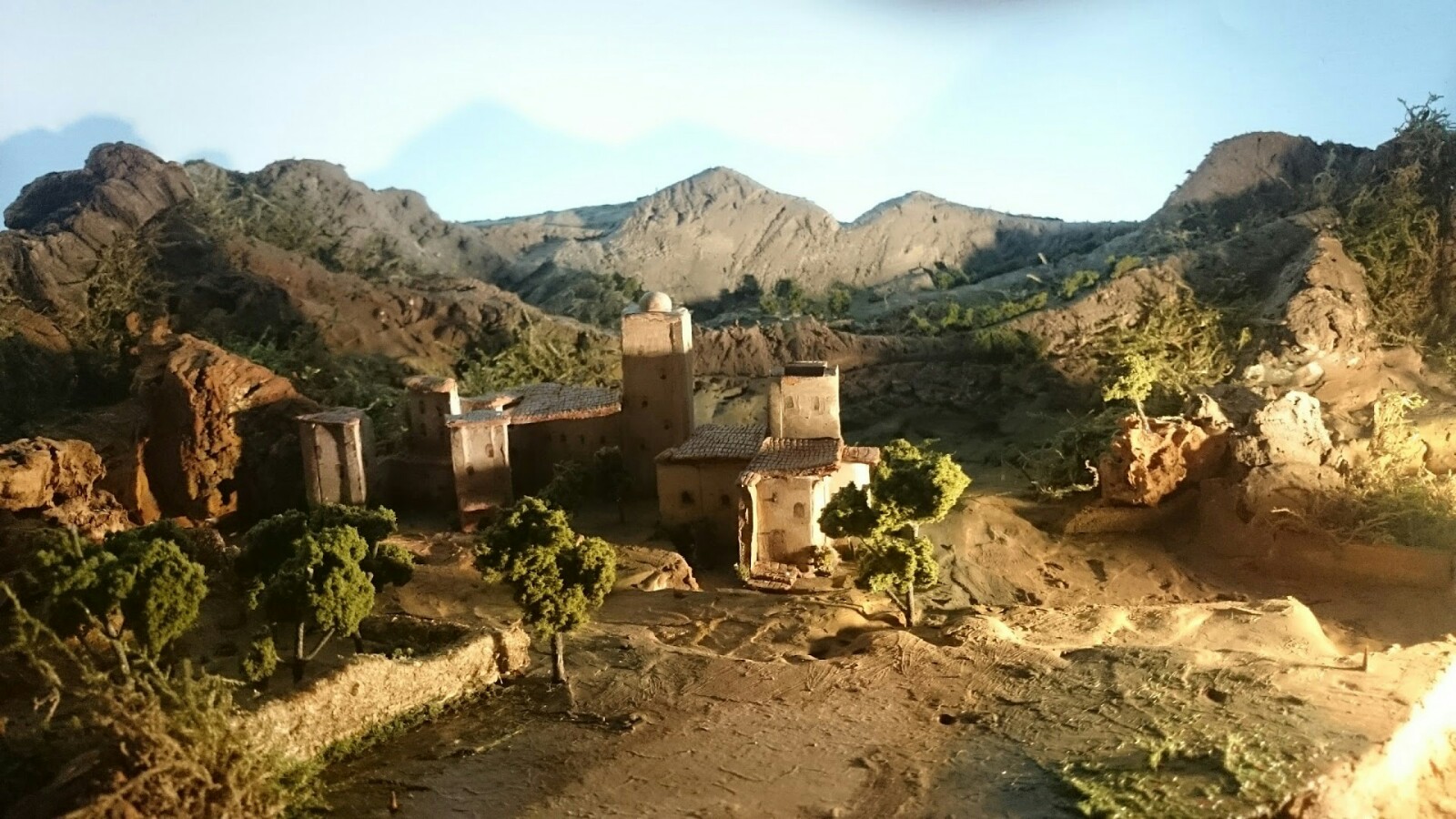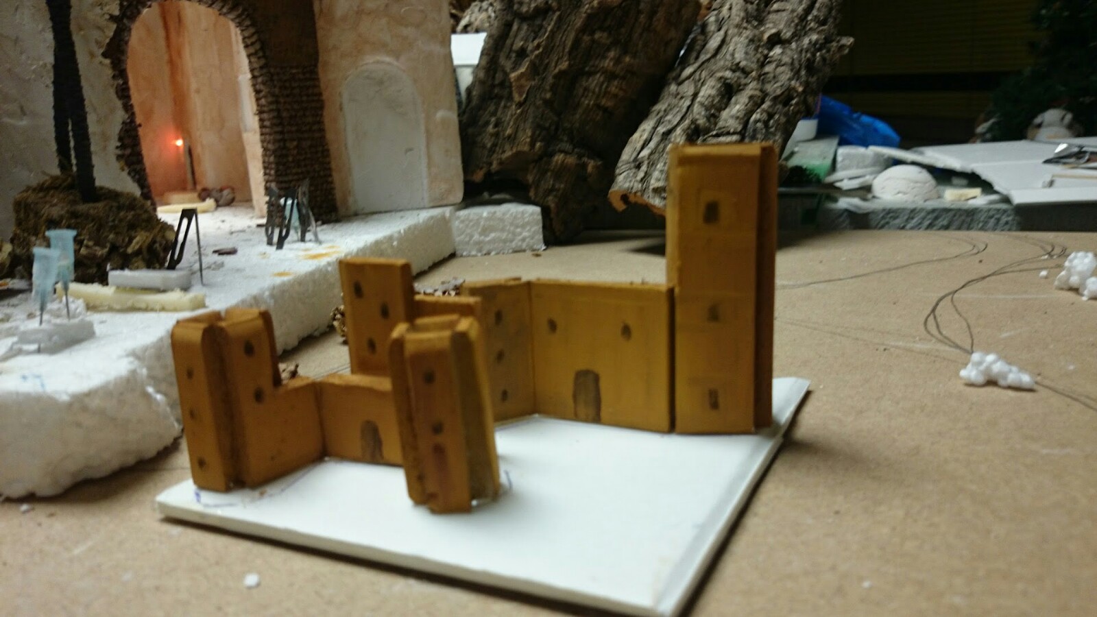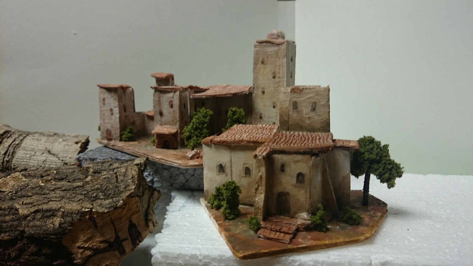 Materiales: Casas (cartón embalaje de caja térmica, escayola, arcilla escolar y acuarelas) Montañas y base (poliestireno expandido y extruido, corcho bornizo, escayola y pintado con pigmentos) Vegetación (ramas naturales y esponja pintada y triturada)