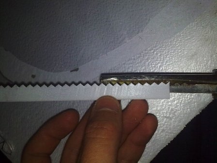 -2 FOTO: cortamos una tira estraga i fina, en una banda le cortaremos dándole forma con las tijeras, luego con el cutter rajaremos por la mitad la tira sin cortarla del todo para que se pueda doblar sin romperse.