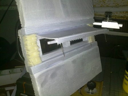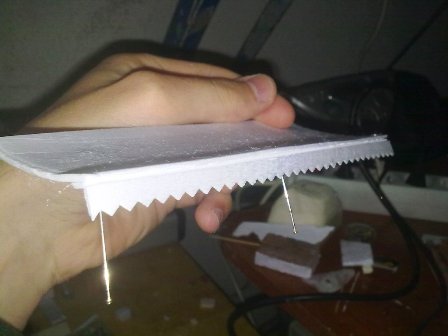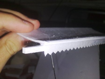 - 3 FOTO: lo doblamos sin romperlo i lo pegamos con cola blanca a la lámina que cortamos al principio, lo pegamos a un borde i para que se sujete le clavamos unas agujas.