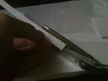 -2 FOTO: cortamos una tira estraga i fina, en una banda le cortaremos dándole forma con las tijeras, luego con el cutter rajaremos por la mitad la tira sin cortarla del todo para que se pueda doblar sin romperse.