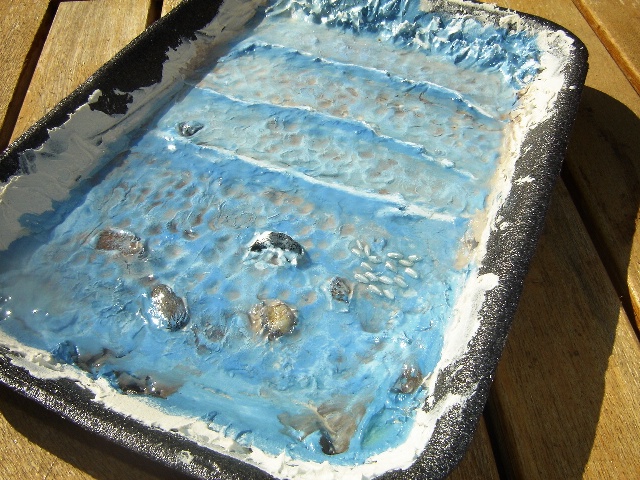 Cuando la masa está mordiente y se puede trabajar bien sin que se vaya pegada al utensilio que vayamos a usar, procedemos a marcar lo que sería el fondo arenoso para que después nos facilite el imitar con la pintura lo que sería el reflejo del sol sobre éste. En este primer intento he usado un punzón de punta redonda, pero pienso que quedaría mejor si se hiciera una especia de esponjeado usando una bola hecha con una bolsa de plástico o papel albal, y dejando marcada la rugosidad que deja ésta sobre la superficie (ahora mismo estoy haciendo un segundo intento de esta forma y cuando lo tenga pongo el resultado para comparar, pero vamos a lo que vamos.). Se pegan también las piedrecitas, plantas, conchas ... o lo que queramos que se vea como si estuviera en el fondo. Hay que tener en cuenta que cuando echemos el agua artificial no se cubrirá mucha altura, por lo que hay que usar piedras casi planas para que hagan el efecto y no sobresalgan. Otra opción es usar la misma masa para hacer las piedras y después pintarlas para crear el efecto que se desee.