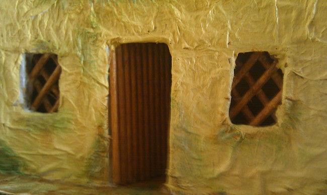 Con palillos de pinchitos se hizo las celosías de las ventanas, la puerta (pegando los palillos al cartón) y las columnas del ventanal superior.