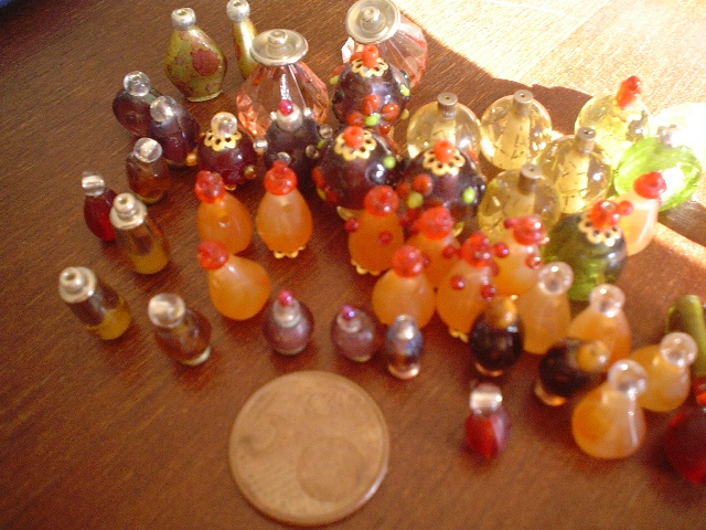Ese fin de semana compré y busqué en casa por alborios que pudiera usar para hacer botellitas de perfume. Usé cuentas chiquitasy otras cosas que encontré como muelles para ropa, cierres de colares,...
