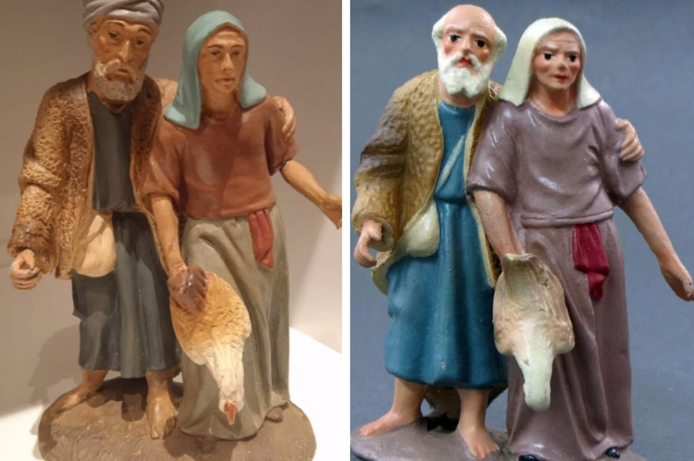 Tienen varios nombres dichas figuras segun la zona son representados por dos verenables ancianos que cogidos del brazo van a llevar sus presentes al Niño al Portal las que muestro en las fotos son una copia sacadas de la fotografia de un libro editado en catalan que se llama "Les Figures Popular del nostre Pessebre" (creo que no hace falta traducción) esta pieza tambien se representa por dos jovenes y se les conoce como "Els enamorats", los enamorados están igual vestidos con el traje de la zona como vestidos a la hebrea se representa tanto de una manera como de otra.