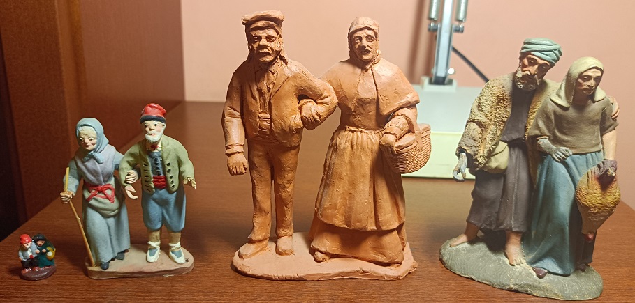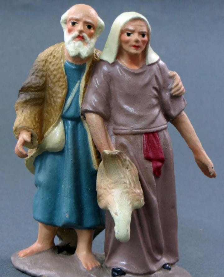 Tienen varios nombres dichas figuras segun la zona son representados por dos verenables ancianos que cogidos del brazo van a llevar sus presentes al Niño al Portal las que muestro en las fotos son una copia sacadas de la fotografia de un libro editado en catalan que se llama "Les Figures Popular del nostre Pessebre" (creo que no hace falta traducción) esta pieza tambien se representa por dos jovenes y se les conoce como "Els enamorats", los enamorados están igual vestidos con el traje de la zona como vestidos a la hebrea se representa tanto de una manera como de otra.