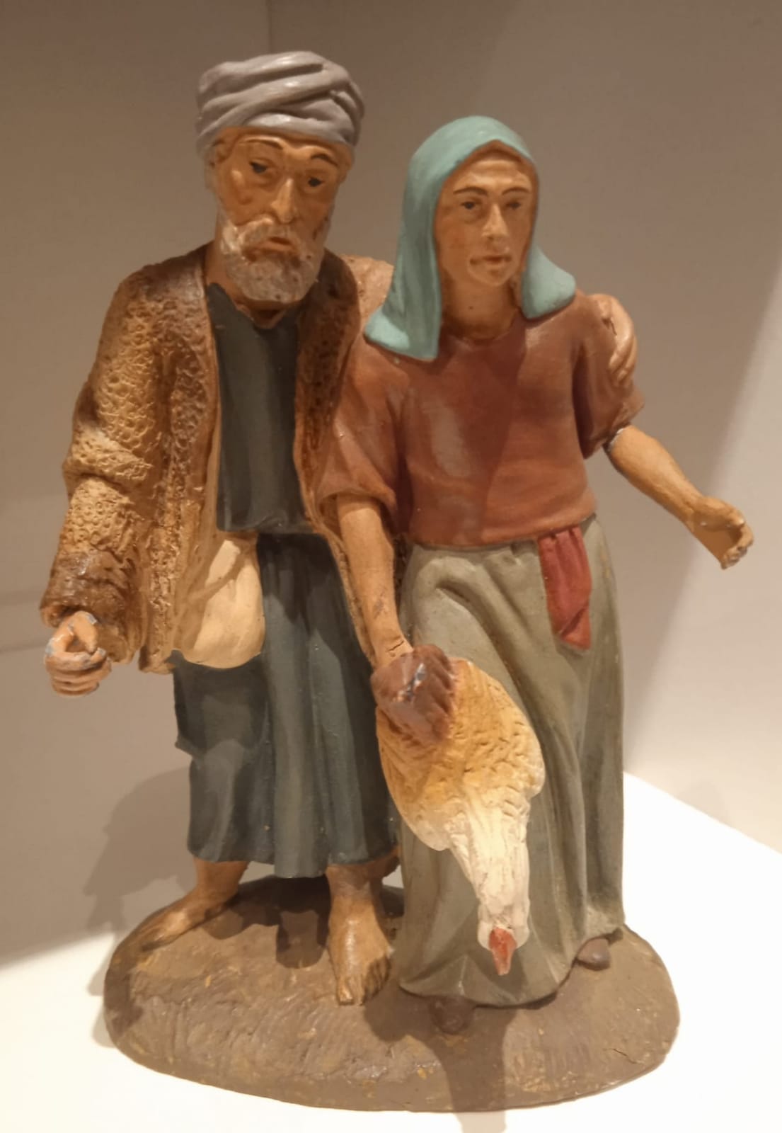 Tienen varios nombres dichas figuras segun la zona son representados por dos verenables ancianos que cogidos del brazo van a llevar sus presentes al Niño al Portal las que muestro en las fotos son una copia sacadas de la fotografia de un libro editado en catalan que se llama "Les Figures Popular del nostre Pessebre" (creo que no hace falta traducción) esta pieza tambien se representa por dos jovenes y se les conoce como "Els enamorats", los enamorados están igual vestidos con el traje de la zona como vestidos a la hebrea se representa tanto de una manera como de otra.
