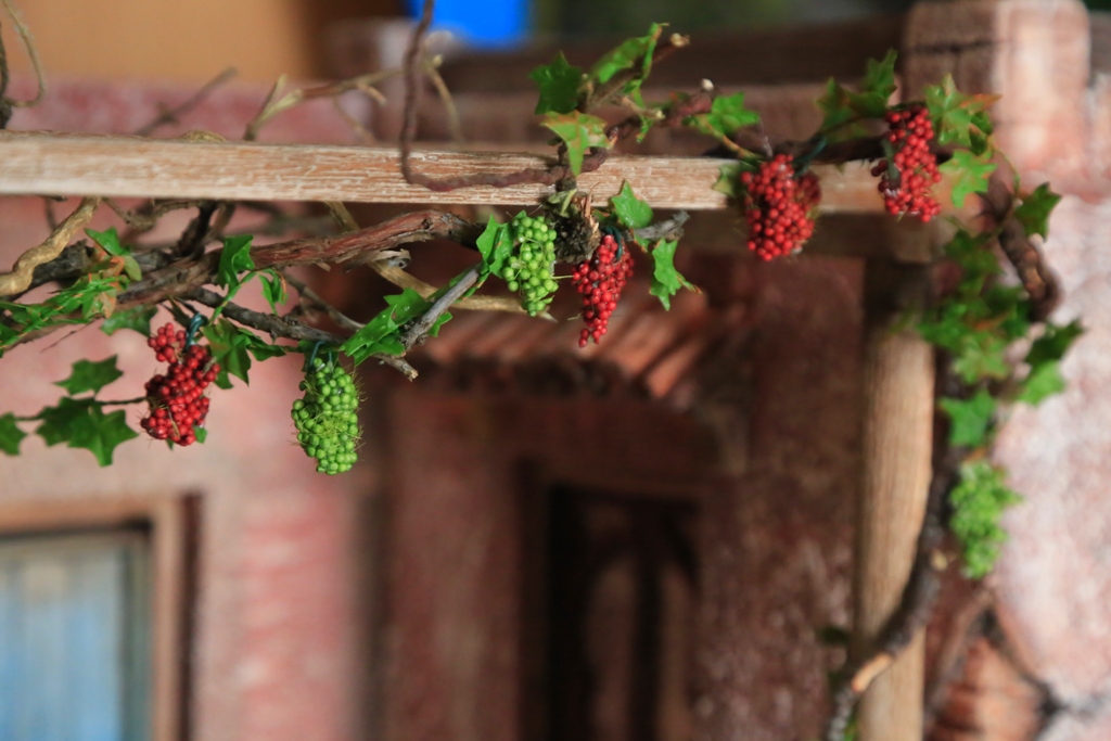 Con tronquitos reales, racimos ideales comprados en tienda belenista y cortados para darles mejor forma y hojas finalmente ...ufffff...que larga búsqueda...compradas en otra tienda belenista de Sevilla y aunque son en realidad hojas de yedra o enredadera, les he cortado las puntas más largas y dan el "pego", je, je. Espero que os guste y nada más. Saludos a todos.