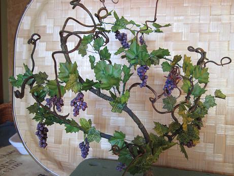 Lo primero es hacer un patrón de hojas de parra en cartón una mas grande y otra mas pequeña, las repasas en tela (una hoja de rosa ) y las recortas, les pasas cola por los bordes con un palillo de dientes porque si no con el tiempo se desfilachan y les pegas alambre de florista del más finito y las pones que se sequen, luego las vas uniendo retorciendo el alambre hasta hacer un sarmiento, teniendo en cuenta pegar siempre las más pequeñas al principio, o sea que se queden al final del sarmiento y después las pegas a los palos (que también son sarmientos de parra secos) y os sale la parra tal cual la veis. Tener en cuenta que las hojas se hacen de una en una. Si tenéis mas preguntas me las hacéis que con gusto os respondo. Gracias.