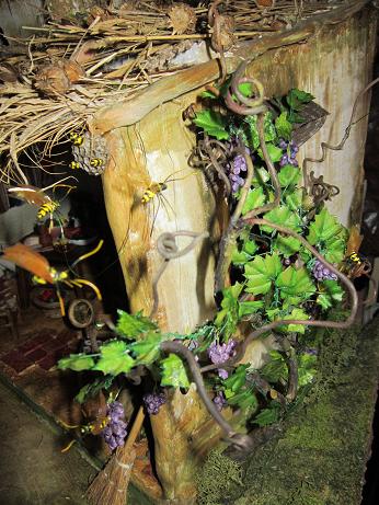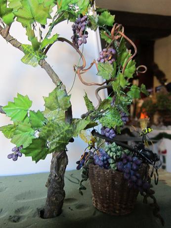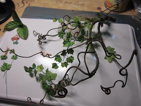 Lo primero es hacer un patrón de hojas de parra en cartón una mas grande y otra mas pequeña, las repasas en tela (una hoja de rosa ) y las recortas, les pasas cola por los bordes con un palillo de dientes porque si no con el tiempo se desfilachan y les pegas alambre de florista del más finito y las pones que se sequen, luego las vas uniendo retorciendo el alambre hasta hacer un sarmiento, teniendo en cuenta pegar siempre las más pequeñas al principio, o sea que se queden al final del sarmiento y después las pegas a los palos (que también son sarmientos de parra secos) y os sale la parra tal cual la veis. Tener en cuenta que las hojas se hacen de una en una. Si tenéis mas preguntas me las hacéis que con gusto os respondo. Gracias.
