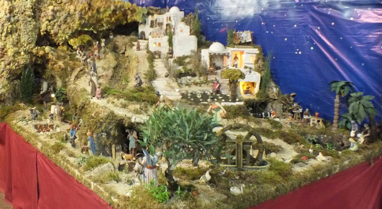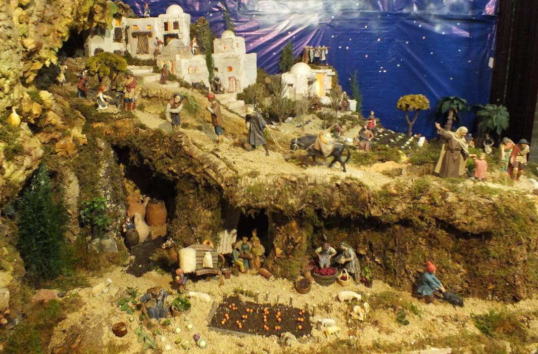 Consta de tres grandes dioramas algo separados con bases de espuma de poliuretano. En ellas, numerosas figuras de distintos tamaños y estilos, aunque pude identificar al menos a la Virgen María (Olot) por ser igual a la que tengo (tema: Figuras: Misterio), pero en color -empiezo a aprender algo, que para eso es idóneo el foro-. Mucho colorido, numerosas figuras con movimiento, así como el agua, norias, etc. Lo que menos me gustó es el fondo en papel, pero menudo trabajo, admirable. Creo que llevó más de un mes, y aún estará un par de semanas más. Adjunto algunas fotos.