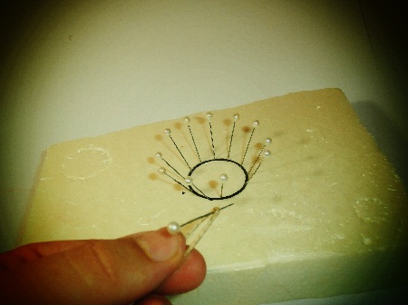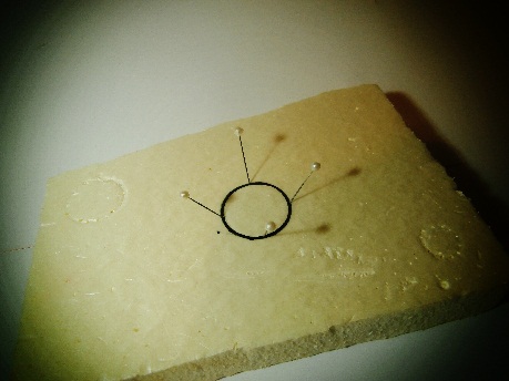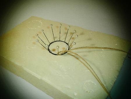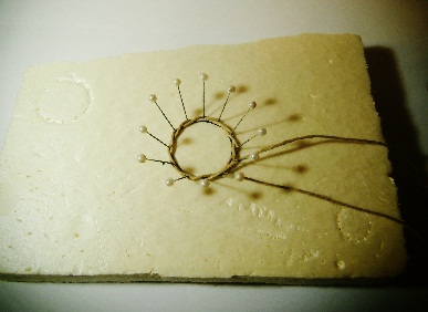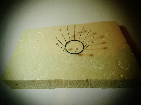 *En segundo lugar distribuímos cuatro alfileres de cabeza gruesa de forma simétrica como si fueran los puntos cardinales (Norte, Sur, Este y Oeste) y posteriormente intercalamos dos alfileres más en cada cuarto de la circunferencia. ( la inclinación de los alfileres determinará la anchura de la boca de la cesta).
