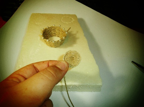 * Si queremos añadir un asa a la cesta no tenemos más que coger un trozo de alambre del tamaño deseado, encolar un trozo de cuerda ( Que sea almenos tres veces la longitud del alambre) y enrrollarla en el alambre. Lo dejamos secar sujeto con unas pinzas y una vez seco le damos forma de asa y lo colocamos en el cesto con pegamento o la misma cola.